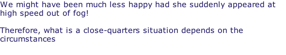 ColRegs Home>ColRegs>Definitions>Close-Quarters Situation back to top A cargo vessel passing across the bows of another - seen from bridge View from the bridge - a cargo vessel passing across the bows of another Warship overtaking a sailing vessel - about 1 cable distant Warship overtaking a sailing vessel - about 1 cable distant We might have been much less happy had she suddenly appeared at high speed out of fog!  Therefore, what is a close-quarters situation depends on the circumstances