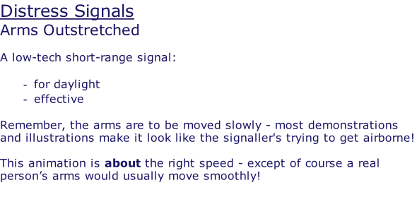 ColRegs Home>ColRegs>Distress>Arms Outstretched back to top Diagram:  A square flag with a ball below A vessel in distress using SOS SOS Red rocket flare falling into the sea Flares & Shells Flag & Ball Diagram:  A float emitting orange smoke Diagram:  A silhouette of a person with arms outstretched to the side Orange Smoke Arms Outstretched
