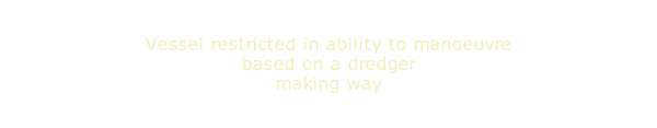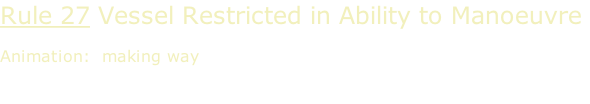 Rule 27 Vessel Restricted in Ability to Manoeuvre  Animation:  making way ColRegs Home>ColRegs>Lights & Shapes>Animations>Restricted Ability Manoeuvre>Making Way Vessel restricted in ability to manoeuvre based on a dredger making way back to top of vessels restricted in ability to manoeuvre A vessel recovering a navigation mark - restricted in her ability to manoeuvre A small vessel engaged in diving operations A vessel engaged in underwater operations where an obstruction exists A vessel engaged in mine clearance operations General requirements Operations with obstruction Diving operations smaller vessels Mine clearance