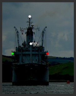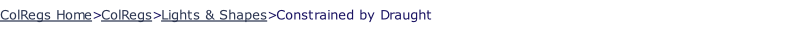 ColRegs Home>ColRegs>Lights & Shapes>Constrained by Draught Rule 28 Vessel Constrained by her Draught  A vessel constrained by her draught in addition to the:  masthead lights  sidelights sternlight  of a power-driven vessel underway Power-driven vessel underway from ahead back to top may exhibit:  where they may best be seen:  cylinder three all-round red lights in a vertical line A vessel constrained by her draught (in the original photo the cylinder was in fact obscured by a mast fitting!) Note:  The definition of vessel constrained by her draught refers only to a power-driven vessel A power-driven vessel underway Vessel constrained by her draft seen from ahead Vessel constrained by her draught Vessel constrained by her draught