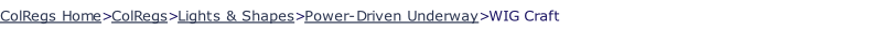 If it is not practicable for a WIG craft (or seaplane) to exhibit:  the prescribed:  lights and  shapes  correct:  shape characteristics position  she shall comply as closely as possible ColRegs Home>ColRegs>Lights & Shapes>Power-Driven Underway>WIG Craft Small WIG craft flying past spectators (UHXRW Hoverwing) Lights for a WIG craft under 12m Image with Permission:  US Navy’s Office of  Information, Washington, DC back to top Power-driven vessel - a bulk carrier Power-driven general Power-driven vessel under 50m - a passenger vessell Under 50m Power-driven vessel under 12m - a motor cruiser Under 12m Power-driven vessel under 7m & 7kts - an excursion boat Under 7m and 7 knots Air-cushion vessel - USN hovercraft WIG craft (Russian) Air-cushion WIG A passenger boat under 50m and a RFA Lengths of vessels