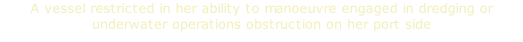 ColRegs Home>ColRegs>Lights & Shapes>Mnemonics yellow over white  towline’s tight Printable mnemonics Pdf file  (Opens in new window Adobe Reader Required) Picture of printable sheet of mnemonics two whites in in a row  is a short tow white over white over white  long tow in sight red over green  is a sailing machine  (but rarely seen) green over white  trawling tonight red over white  fishing tonight two red  the captain’s abed red white red  restricted ahead green green good  (the green lights indicate the “safe” side) diamonds are our best friend  (the diamonds indicate the “safe” side) red red red  rudder rubbing  rocks white over red  pilot ahead some people prefer to remember this by thinking of the:  white cap over the breathless flushed face  of the pilot after climbing all the way from the boat to the ship’s bridge!  pilot ahead anchor light(s) with two red   mean I’m stuck to the seabed Towing and Pushing A vessel towing seen from astern A vessel engaged in towing showing a towing light over a sternlight Vessel under 50m engaged in towing - length of tow not more than 200m A vessel under 50m engaged in towing showing two masthead lights to indicate towing but the length of the tow is not more than 200m Vessel under 50m engaged in towing - length of tow more than 200m A vessel under 50m engaged in towing showing three masthead lights to indicate towing length of the tow is more than 200m Vessel Under Sail (Optional Lights) A vessel under sail showing optional lights A vessel under sail showing optional red over green lights these lights are not very common Fishing A vessel under 50m making way, engaged in trawling showing signal, all-round lights and sidelight A vessel under 50m engaged in trawling making way A vessel engaged in fishing other than trawling showing signal, all-round lights and sidelight A vessel engaged in “fishing other than trawling” making way Not Under Command A merchant vessel showing the signals for a vessel not under command A vessel not under command not making way Restricted Ability to Manoeuvre A vessel recovering a navigation mark - restricted in her ability to manoeuvre A vessel restricted in her ability to manoeuvre not making way A vessel engaged in underwater operations where an obstruction exists on her starboard side - not making way A vessel restricted in her ability to manoeuvre engaged in dredging or underwater operations with obstruction on her port side A vessel restricted in her ability to manoeuvre engaged in dredging or underwater operations obstruction on her starboard side not making way A vessel restricted in her ability to manoeuvre engaged in dredging or underwater operations obstruction on her port side Vessel Constrained by her Draught Vessel constrained by her draft seen from ahead A vessel constrained by her draught Pilot Vessels Vessel engaged in pilotage duties underway A vessel engaged in pilotage duty underway Drawing:  a "pilot" with a red face - breathless from climbing to the ship's bridge - wearing a cap with a white cove A breathless, flushed pilot! Aground Two vessels aground - smaller is under 50m Two vessels aground Under 50m only one anchor light exhibited Lights give no indication of length back to top