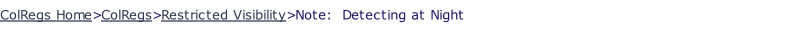back to top ColRegs Home>ColRegs>Restricted Visibility>Note:  Detecting at Night View ahead from a small boat showing other vessels' lights and a light on a headland View ahead from a small boat showing other vessels and a headland In deteriorating visibility:  dimmer and more distant lights become indistinct or obscured other lights often develop a “halo” or blurring searchlight or lighthouse beams become more obvious: View ahead from a small boat showing a headland In the absence of other lights, deterioration is often first indicated by “backscatter”   Backscatter is the vessel’s own lights being reflected from particles in the air  This is shown in the next 2 pictures: View ahead from a small boat showing severe backscatter from sidelights View ahead from a small boat showing other vessels' lights and a light on a headland in restricted visibility