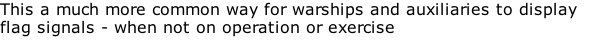 back to top ColRegs Home>ColRegs>Signals>Manoeuvring & Warn>Concern>Note: Signal Displayed Here it’s just visible above international code flag H: “Hover” mouse pointer over picture to view enlargement  A Royal Navy warship with a small motor boat closing - risk of collision exists Unusually, the international code pennant was not displayed above the “D” flag  It’s used to confirm that the signal is to be read from the international code instead of as a navy signal: A Royal Fleet Auxiliary displaying International Code flag H and Code Pennant “I have a pilot on board” A Royal Fleet Auxiliary displaying International Code flag H and Code Pennant This a much more common way for warships and auxiliaries to display flag signals - when not on operation or exercise International Code of Signals:   Code and Answering Pennant “Keep clear of me; I am manoeuvring with difficulty”