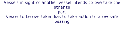 ColRegs Home>ColRegs>Signals>Manoeuvring & Warn>Overtaking in Narrow Channel or Fairway back to top The animations below show:  vessels in sight of one another in a: narrow channel or fairway  Where:  one intends to overtake the other and the vessel to be overtaken has to take action to allow safe passing Vessels in sight of another vessel intends to overtake the other to starboard Vessel to be overtaken has to take action to allow safe passing Vessels in sight of another vessel intends to overtake the other to port Vessel to be overtaken has to take action to allow safe passing Vessels in sight of another vessel intends to overtake the other to starboard Vessel to be overtaken has to take action to allow safe passing but indicates “doubt” There is no provision in the ColRegs for these sound signals to be supplemented by a light signal The vessels above being overtaken will usually give the sound signal to indicate that they are altering course Diagram of a vessel approaching a bend where the view is obscured Diagram of vessels manoeuvring in sight of each other Diagram of one vessel overtaking another A Royal Navy warship with a small motor boat closing - risk of collision exists Power-driven altering course and astern Concern at another vessel Overtaking in narrow channel or fairway View obscured in narrow channel or fairway